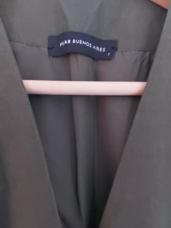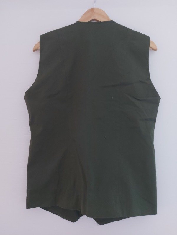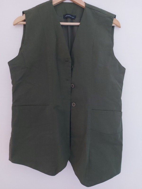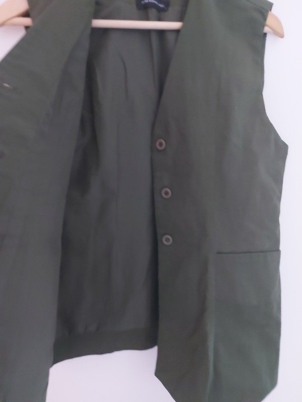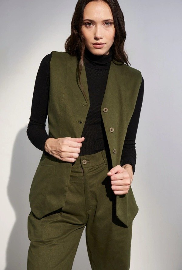 Chaleco sastrero, marca Pilar Buenos Aires, color verde seco. Está forrado a tono, tiene cerramiento frontal delantero cruzado y posee tres botones. Su moldería es oversize, posee bolsillos y pinzas escondidas en recortes delanteros y espalda que generan el calce perfecto. En el bajo delantero tiene forma de pico.