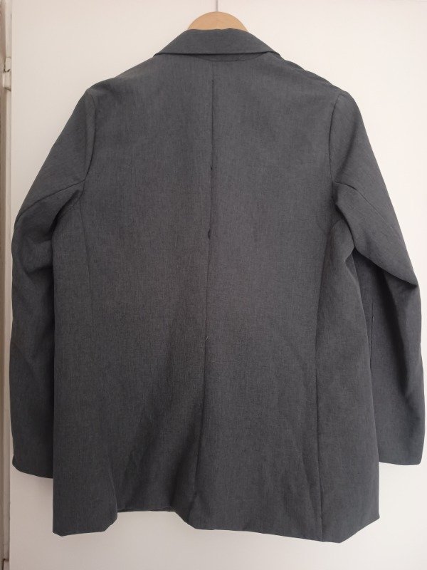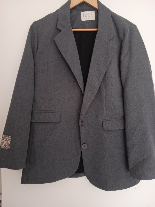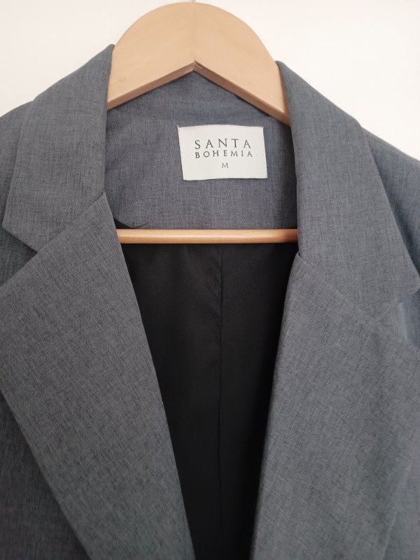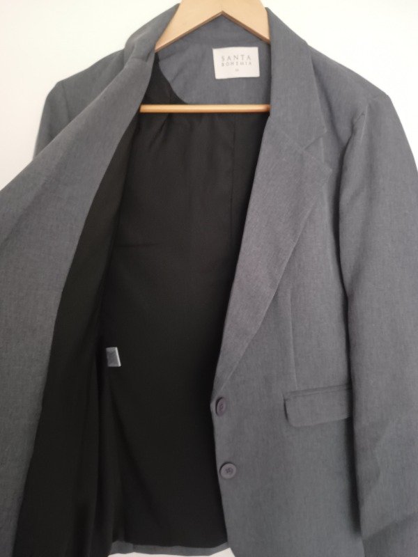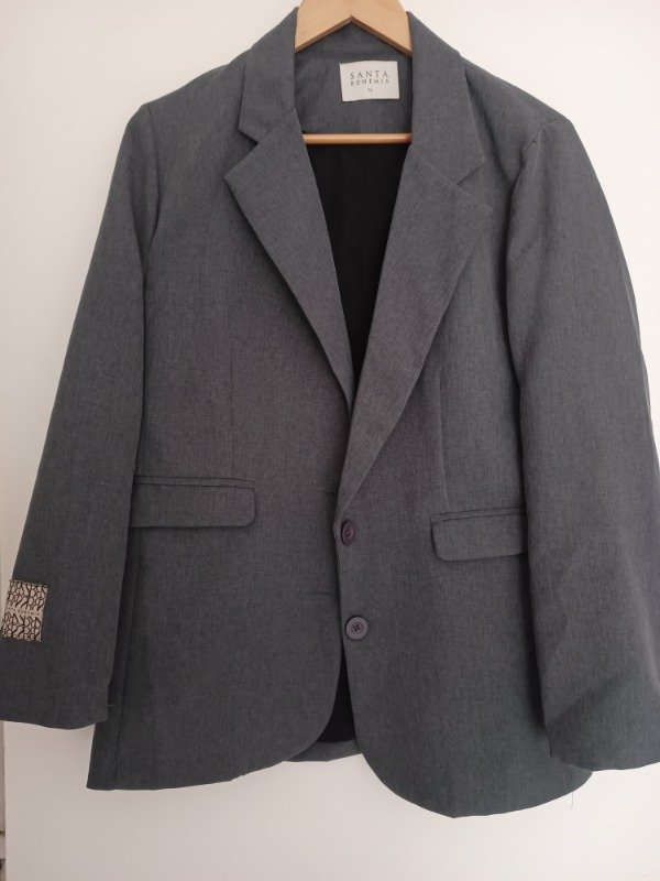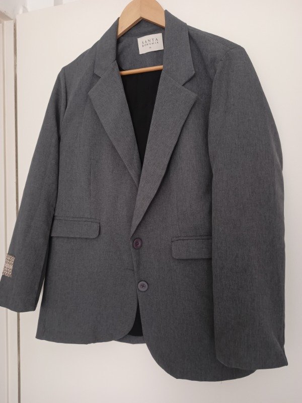 Blazer marca Santa Bohemia, amplio, en color gris, totalmente forrado