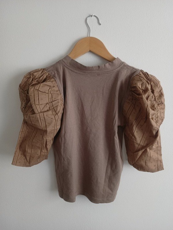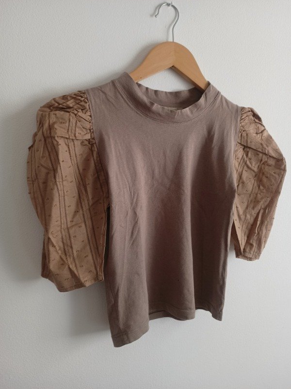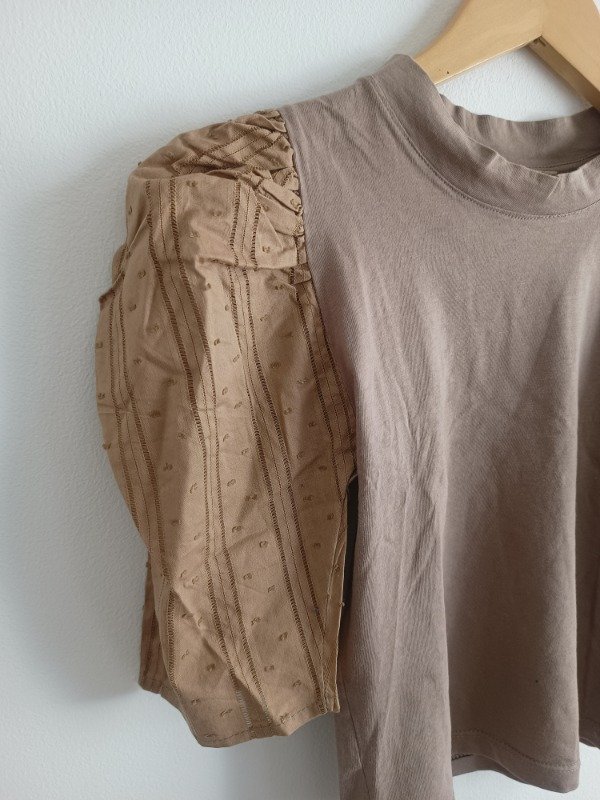 Blusa marca Heidi Clair, en tono vison, con mangas globo de encaje