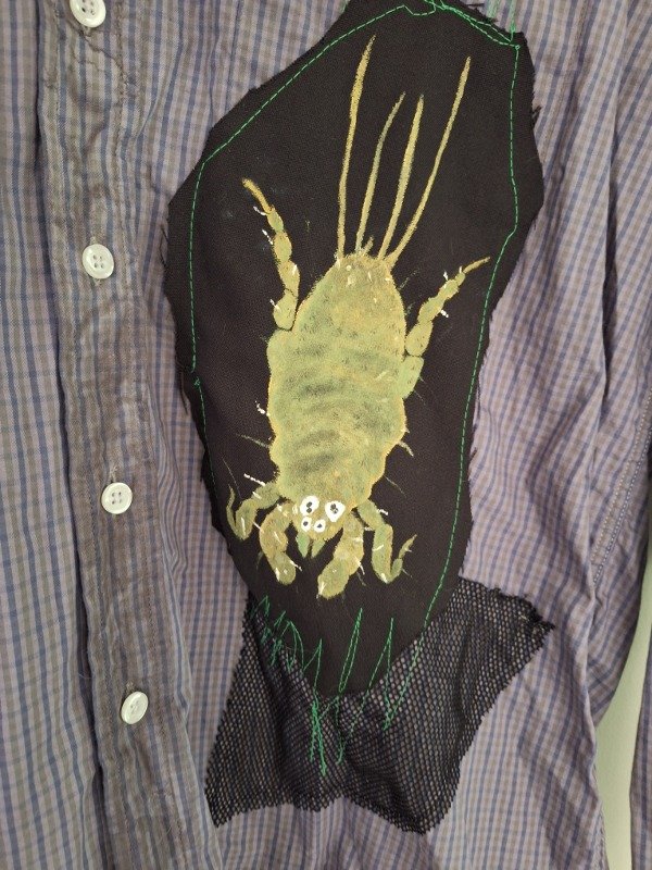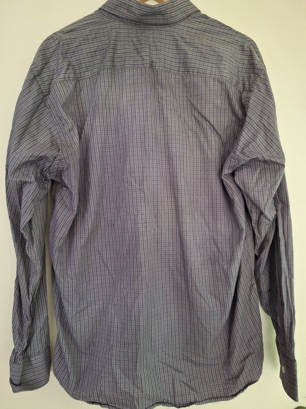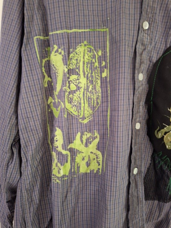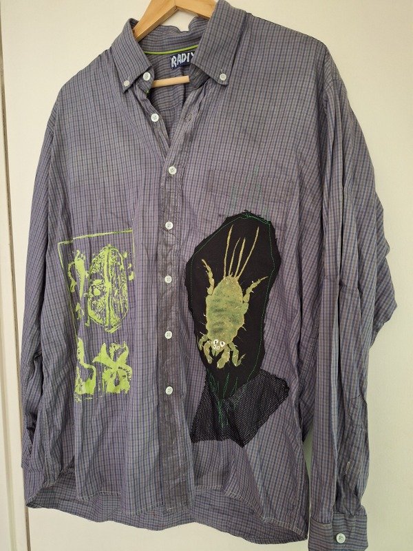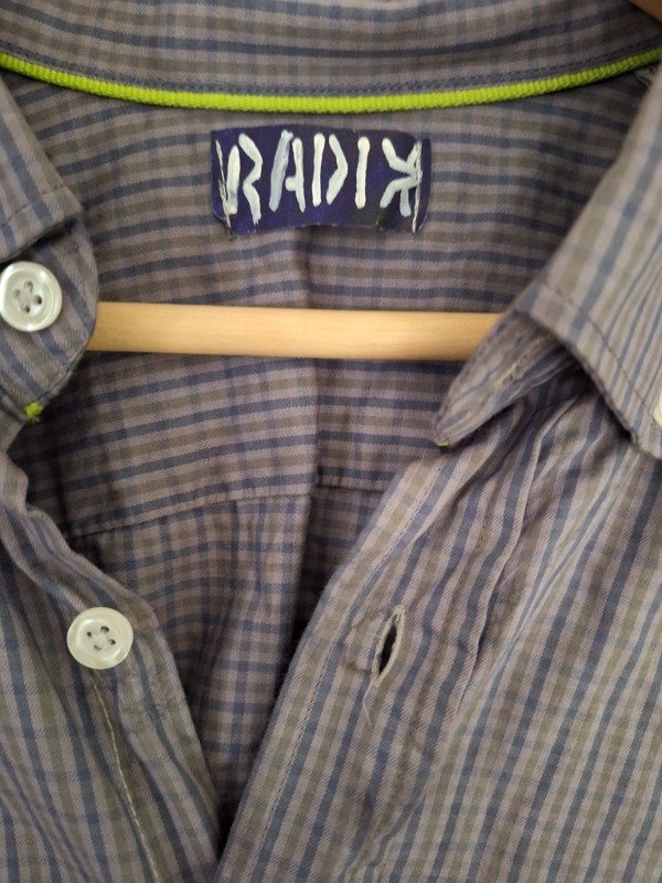 Camisa marca Radik, a cuadras, en tonos azul, con diseño en el frente