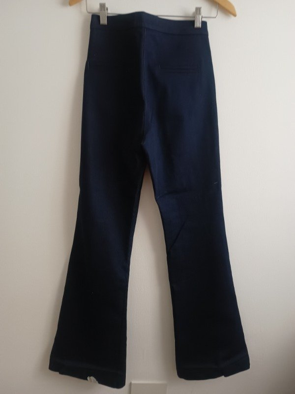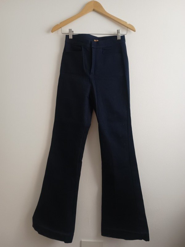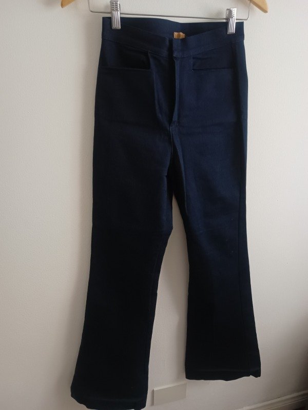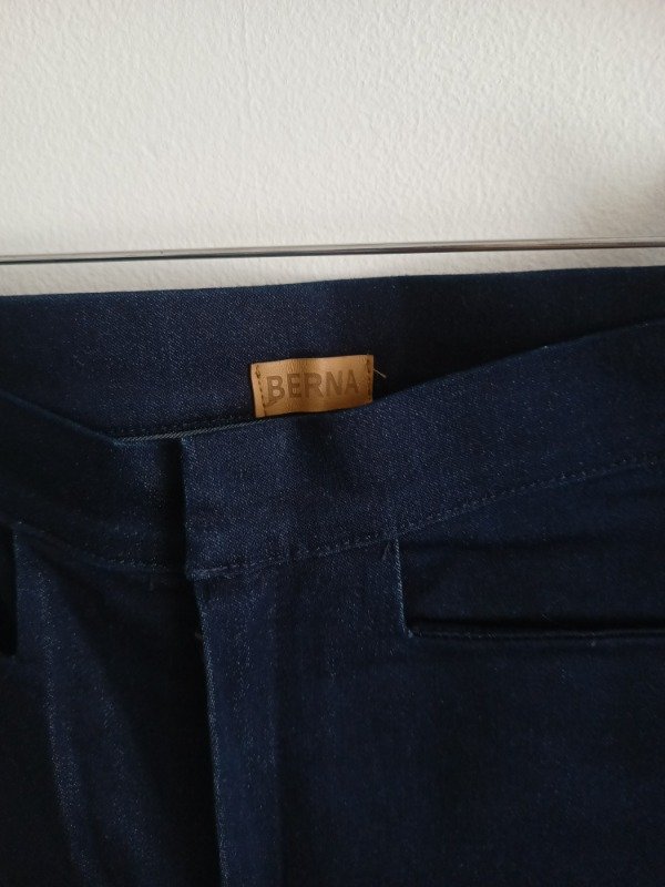 Pantalón marca Berna, modelo actual LYON, semi oxford, cintura alta, bolsillos laterales, falso bolsillo plaqué por detrás, gancho pantalonero. Confeccionado en denim azul elastizado importado