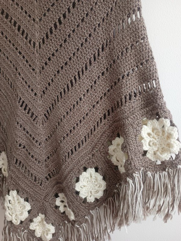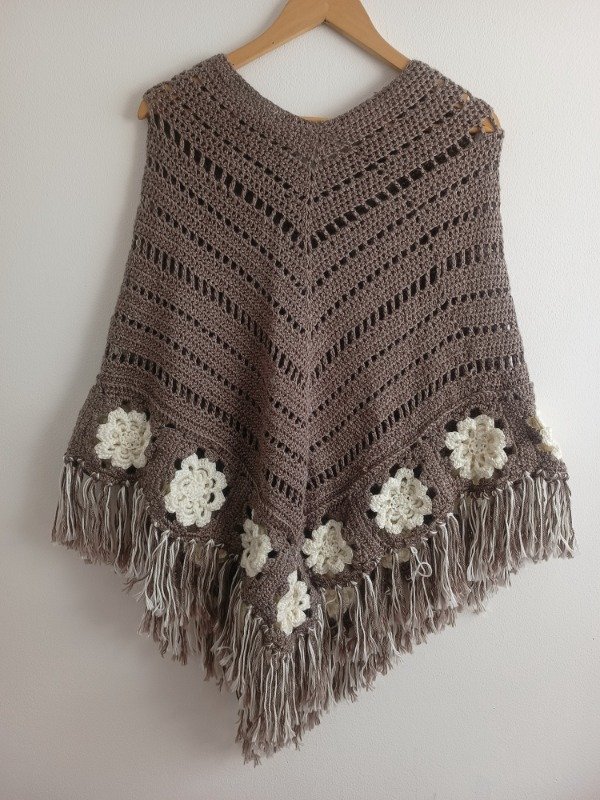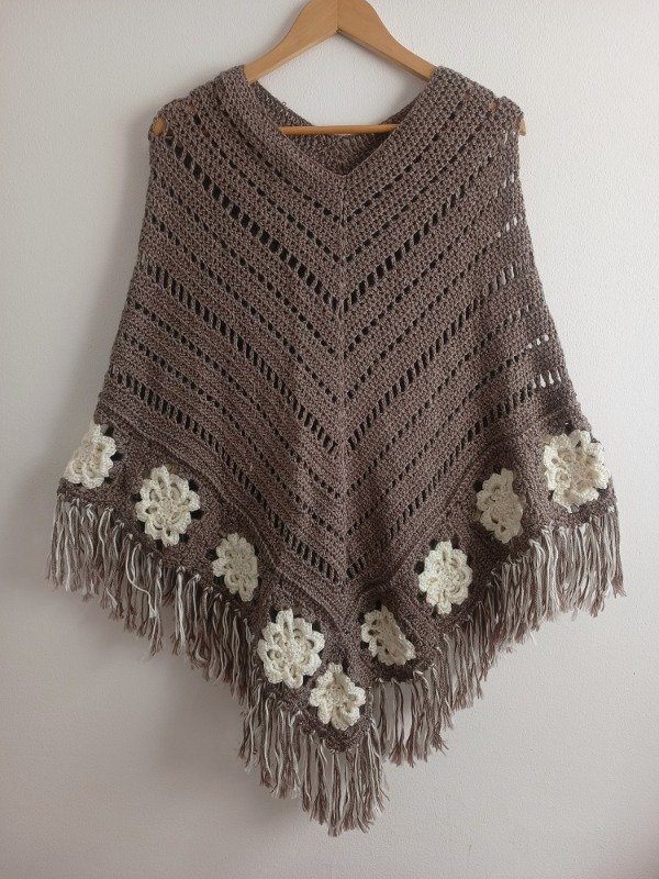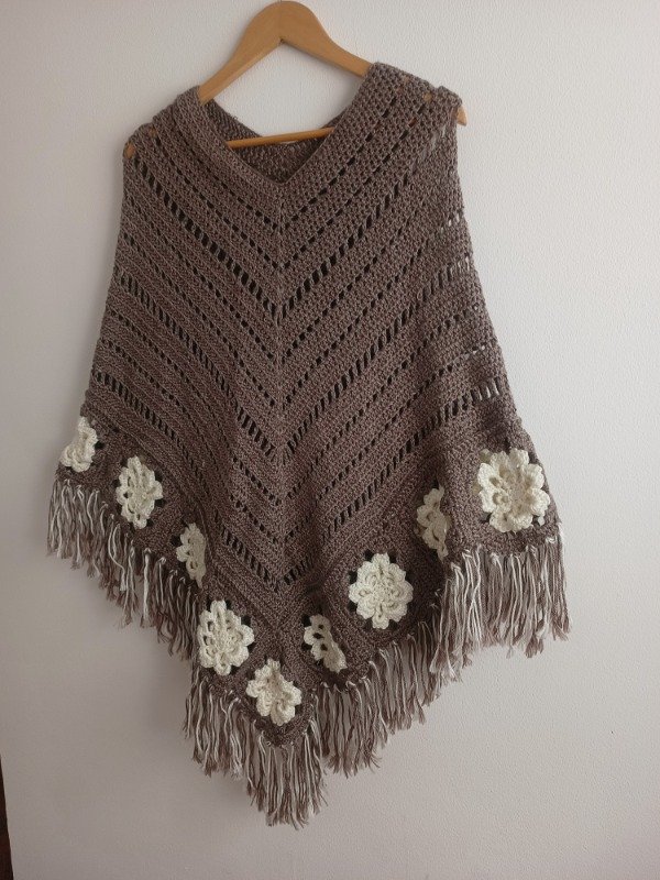Poncho amplio, en tono vison con detalle de flores bordadas