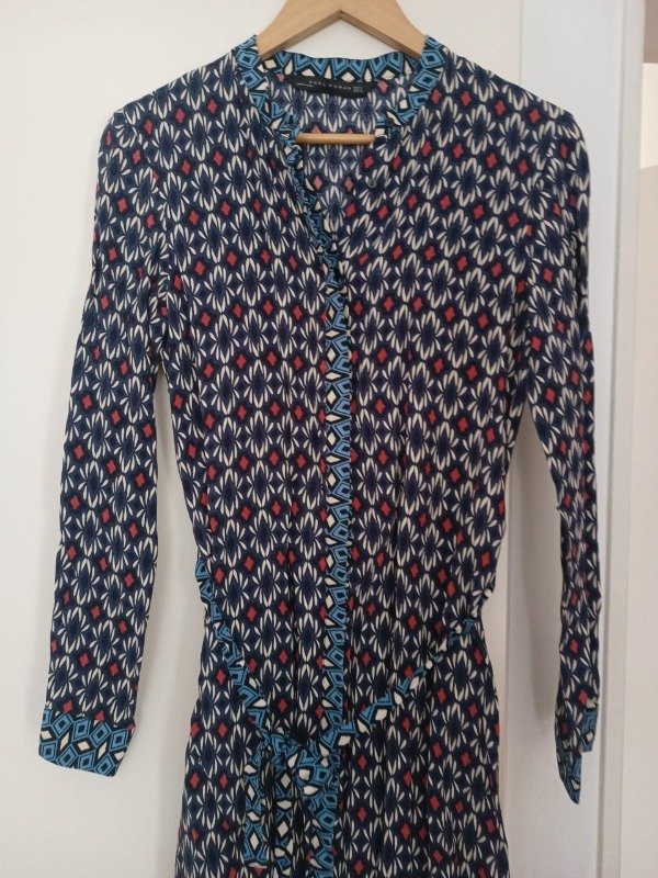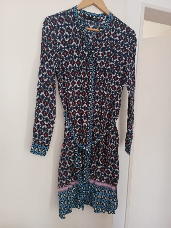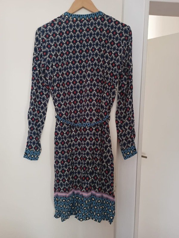 vestido de crepe azul con blanco y bordo con dibujos de arabescos, coon cinturon en la cintura
