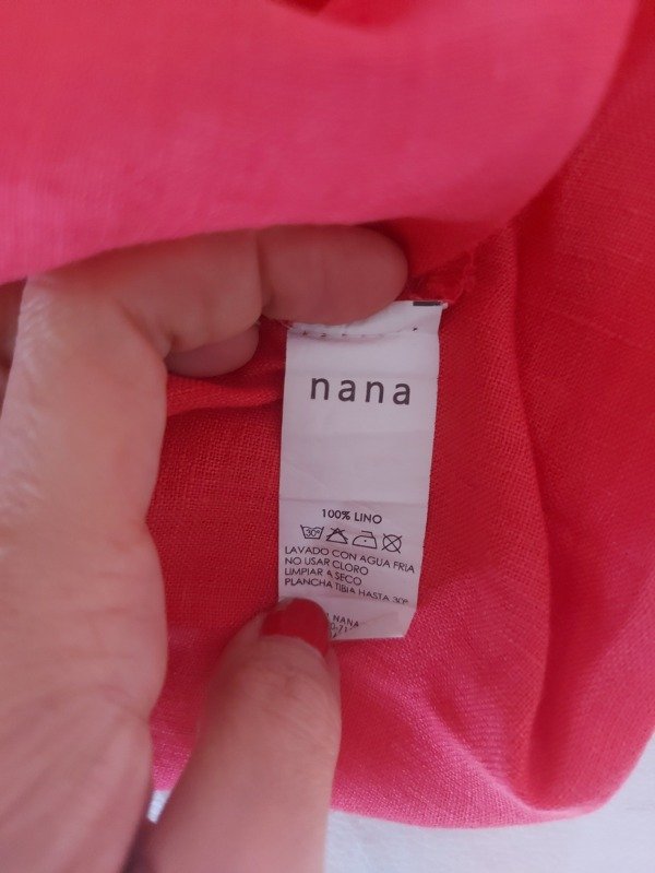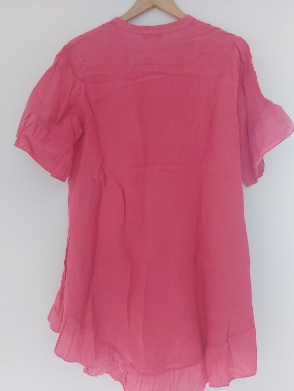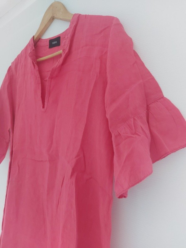 Vestido amplio, de lino, marca Nana, en color coral, de mangas cortas amplias, y volados en ruedo