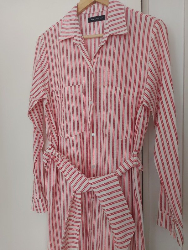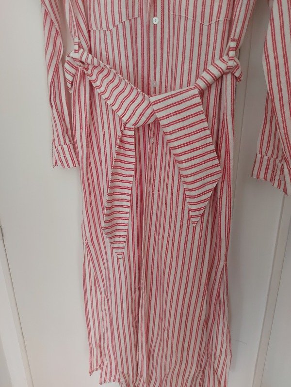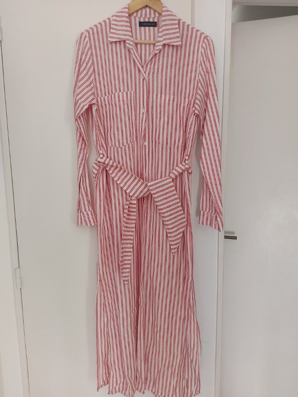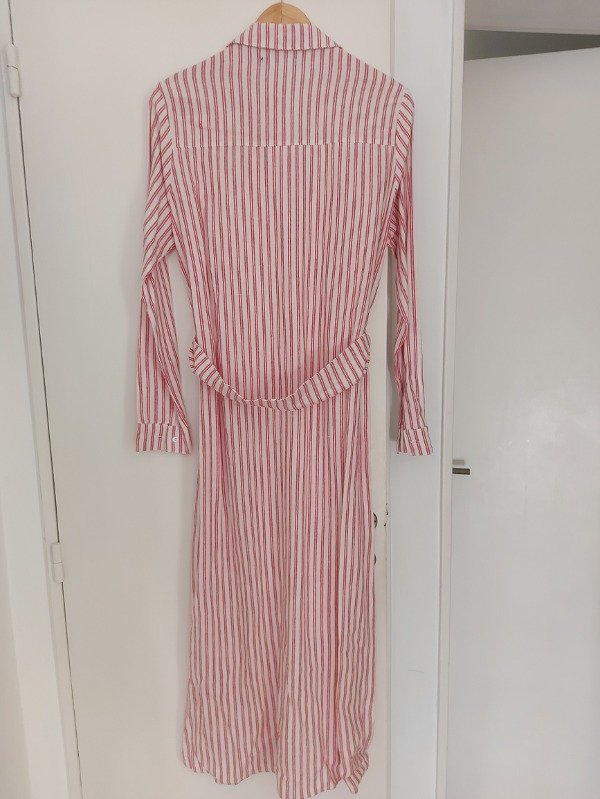 Vestido camisero marca Pilar de Buenos Aires, tipo lino largo, a rayas. Posee importante lazo para ajustar en la cintura