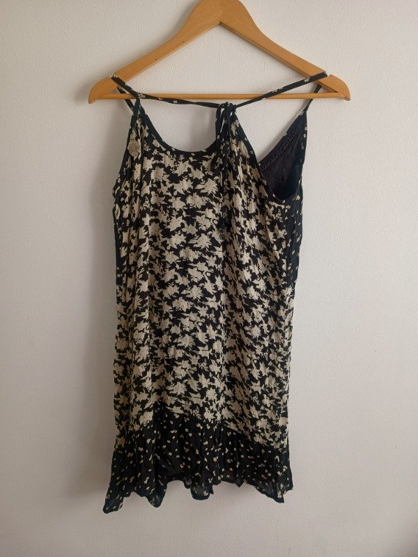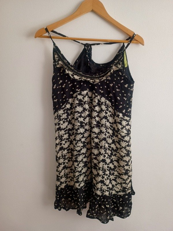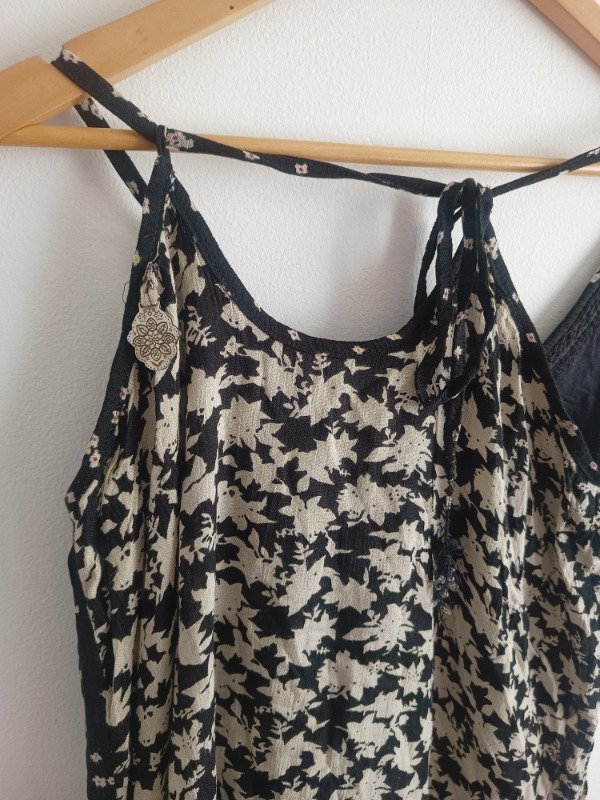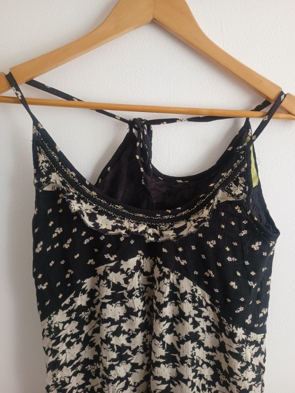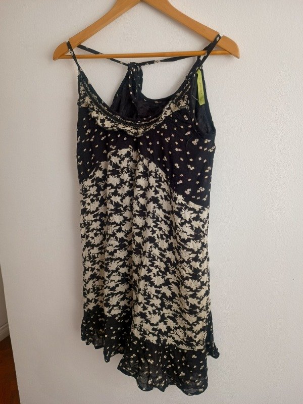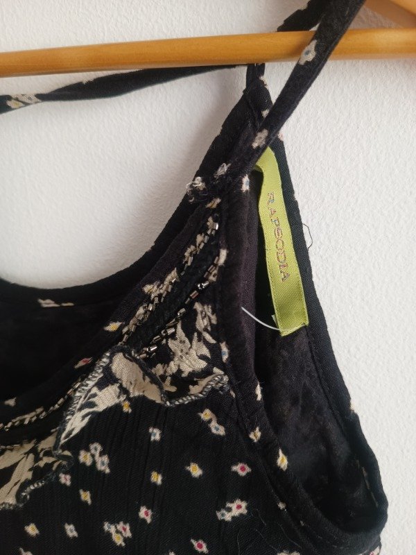 Vestido marca Rapsodia, en tono natural y negro, con detalles de canutilos en escote.