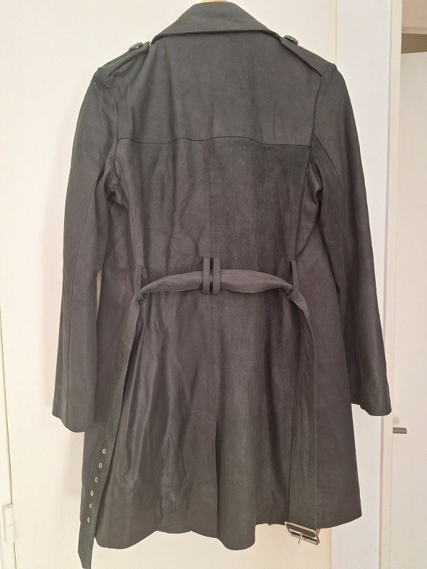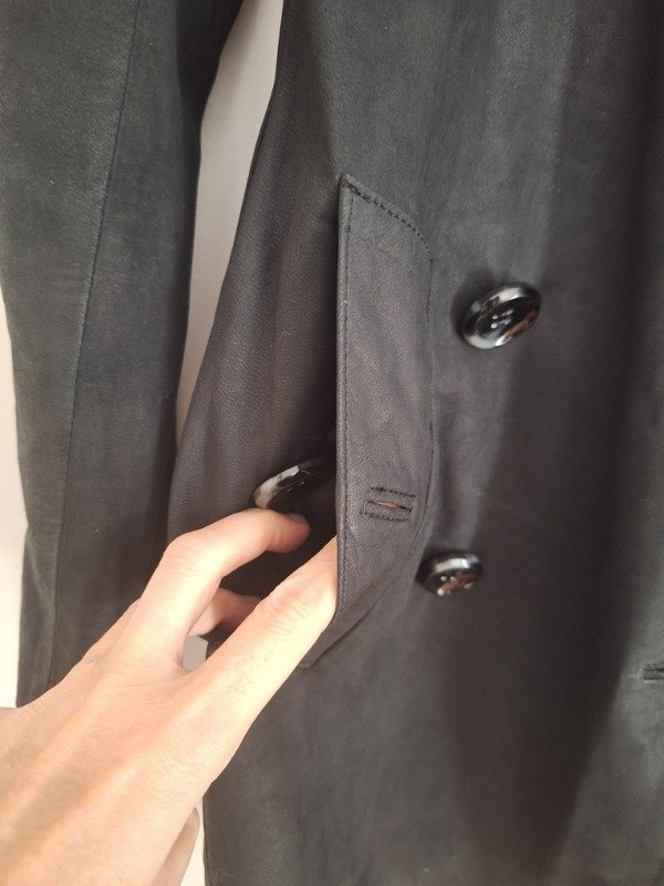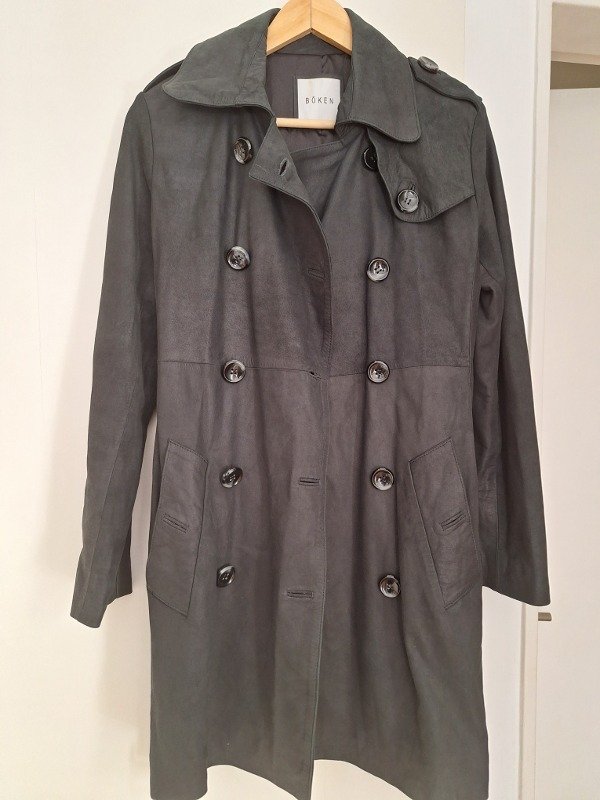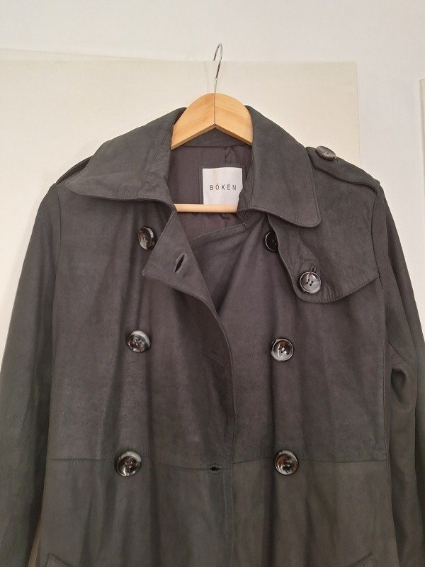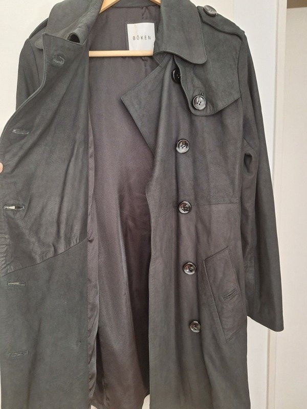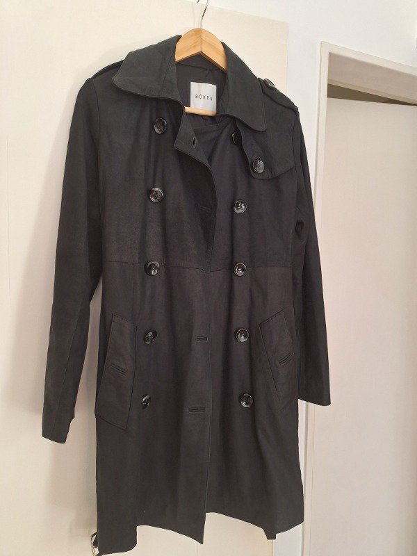 Trench de cuero marca Boken, en color negro, totalmente forrado y cinto para ajustar con hebilla