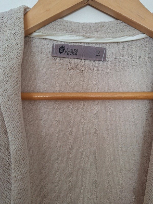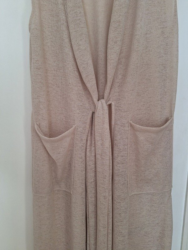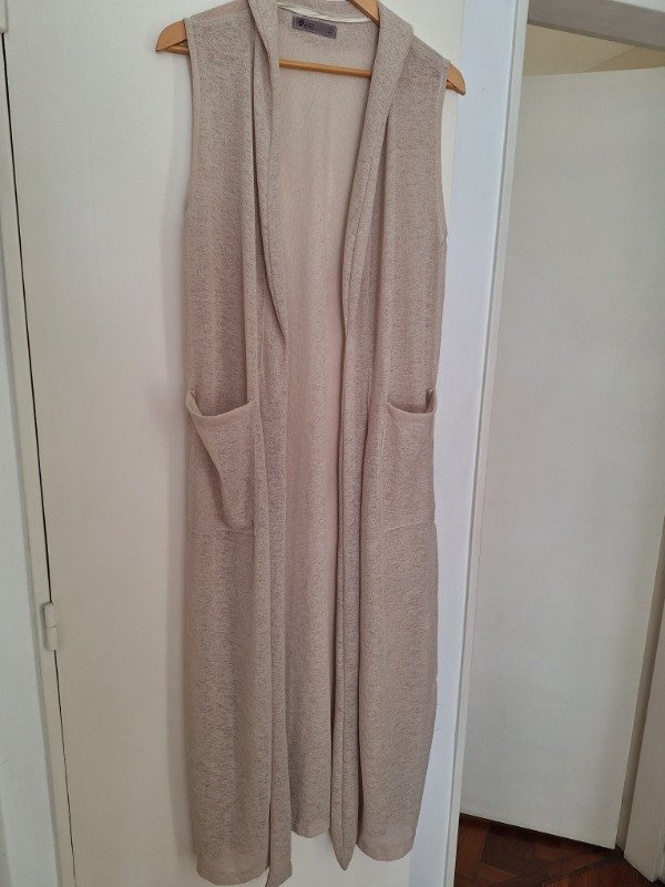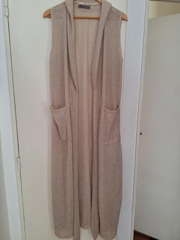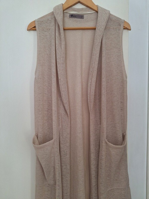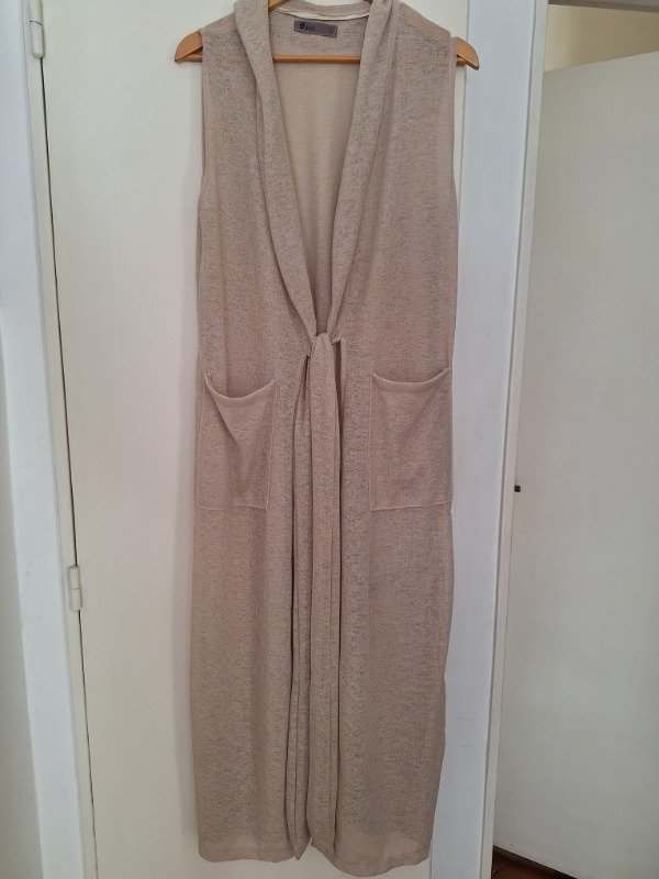 Chaleco marca Justa Petra, largo, con bolsillos y lazo para ajustar la cintura