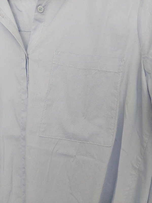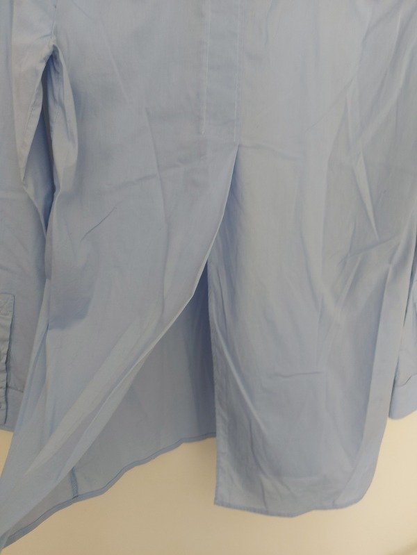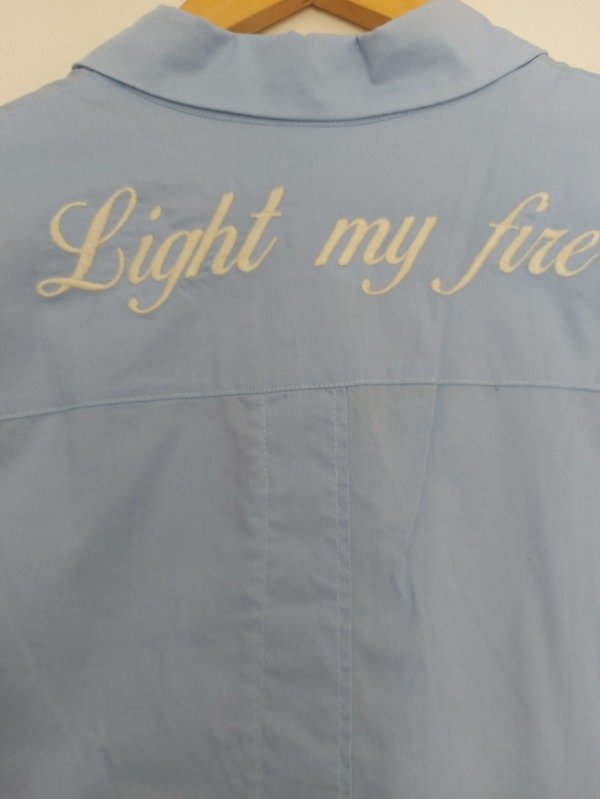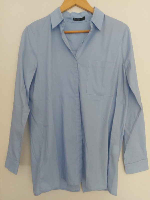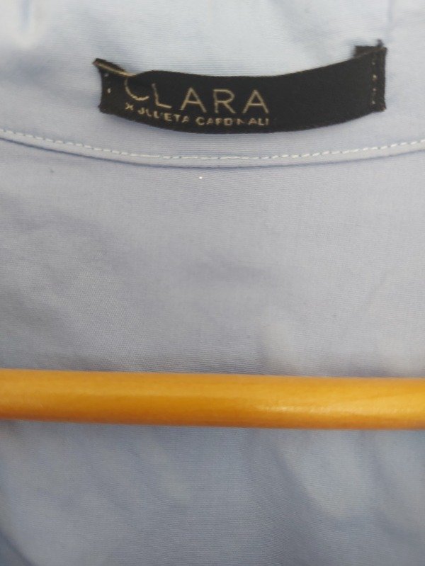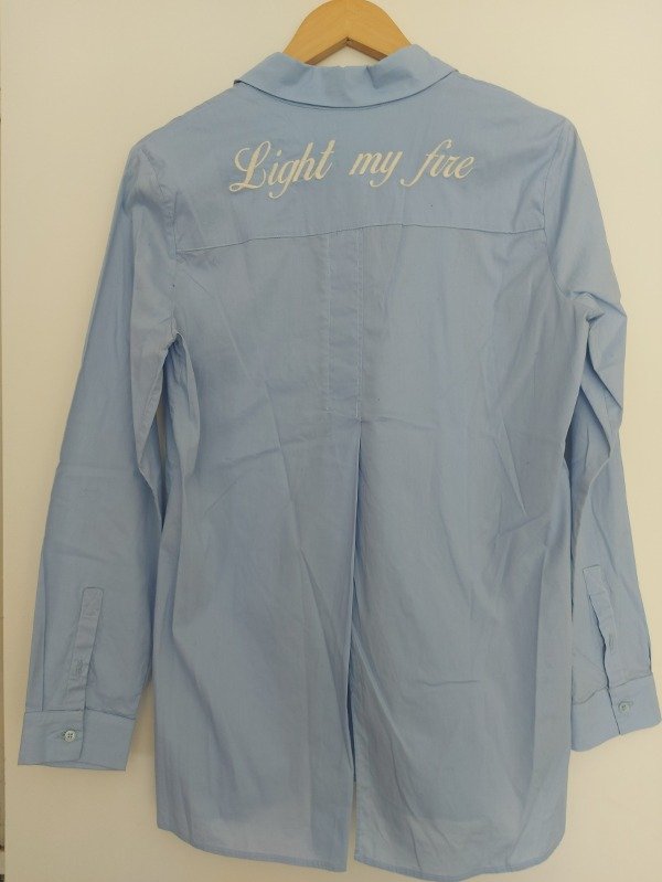 Camisa marca Clara Ibarguren, larga, en color celeste, con bolsillo al frente y bordado en la espalda. Algodón y spandex.