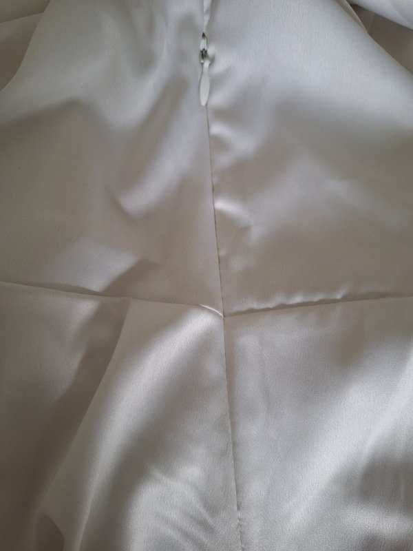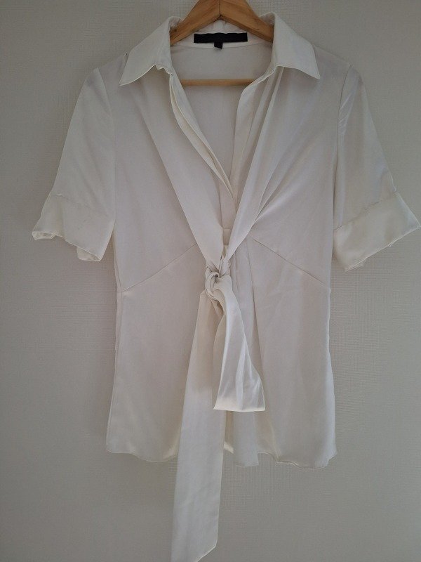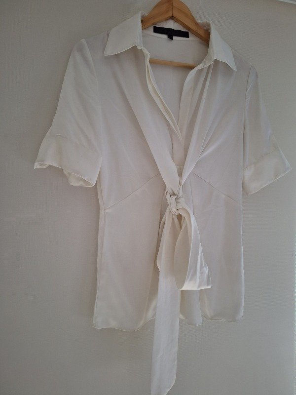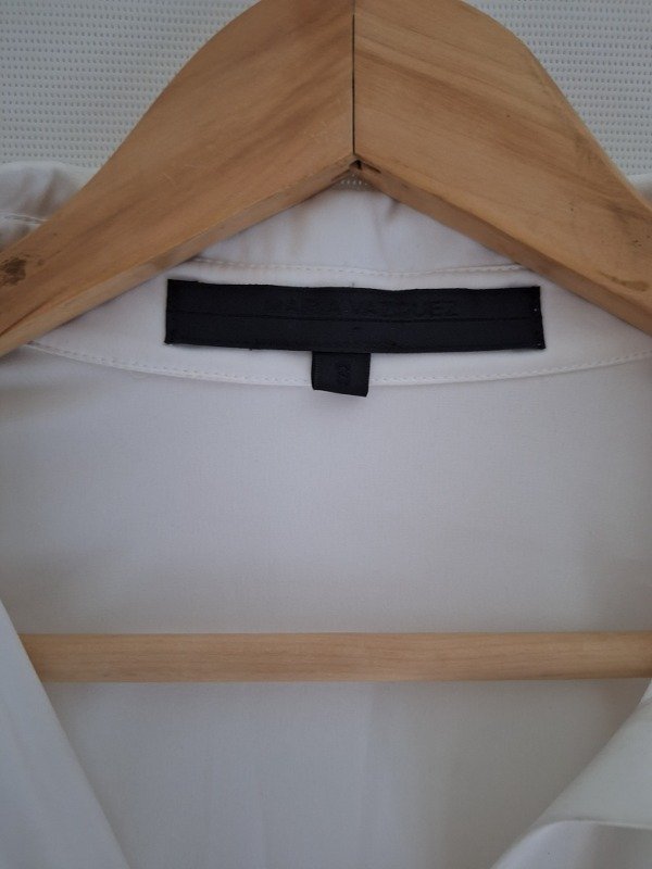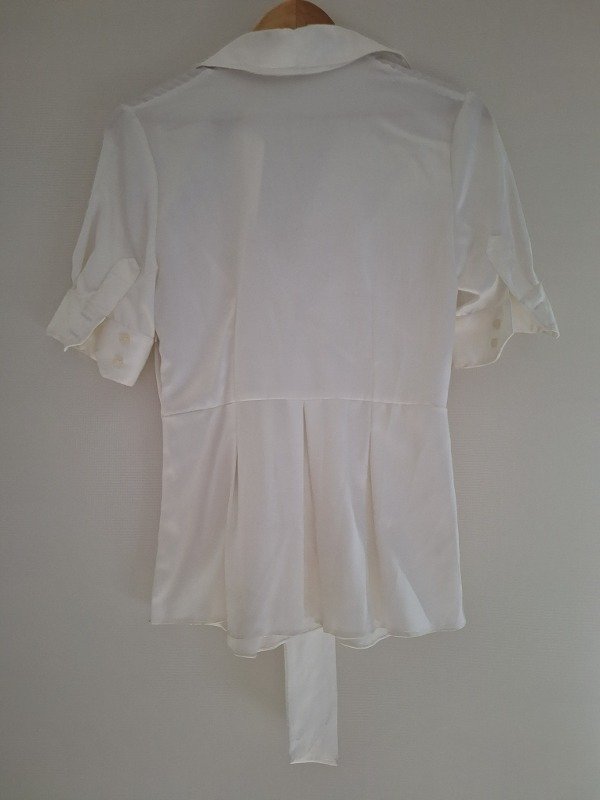 Camisa de seda marca Maria Vazquez, en color blanco, con botones al codo y lazo para ajustar adelante o por detrás.
