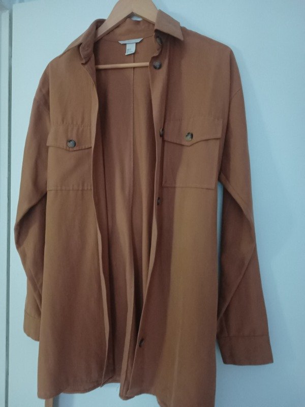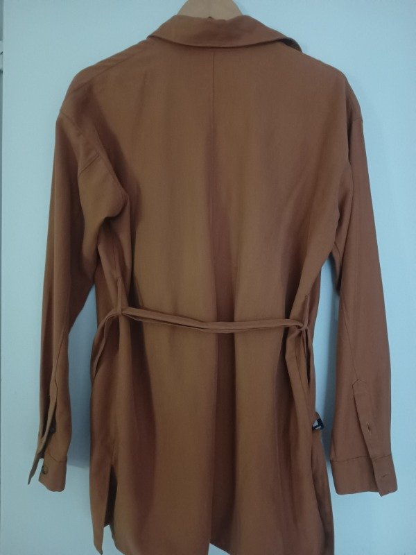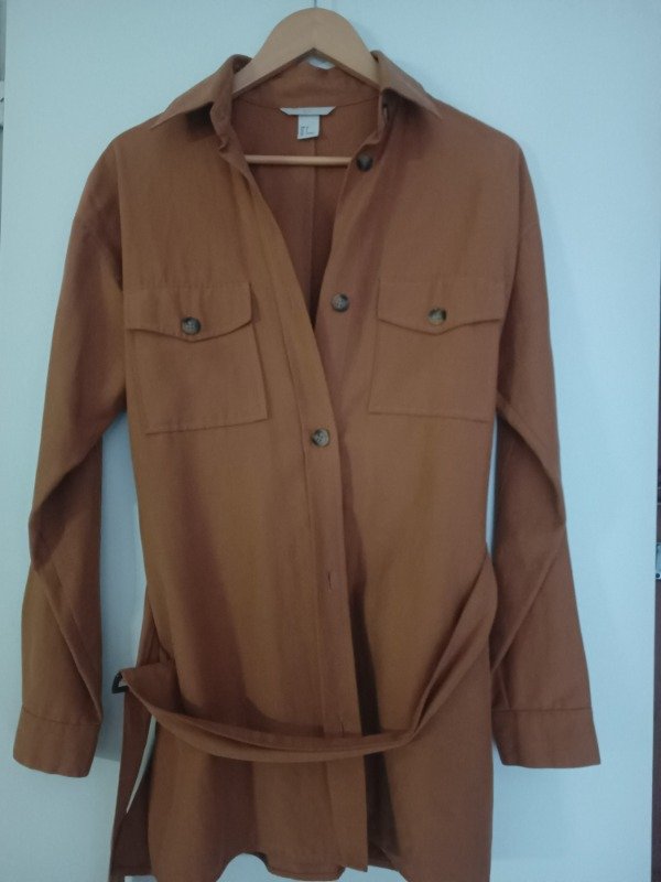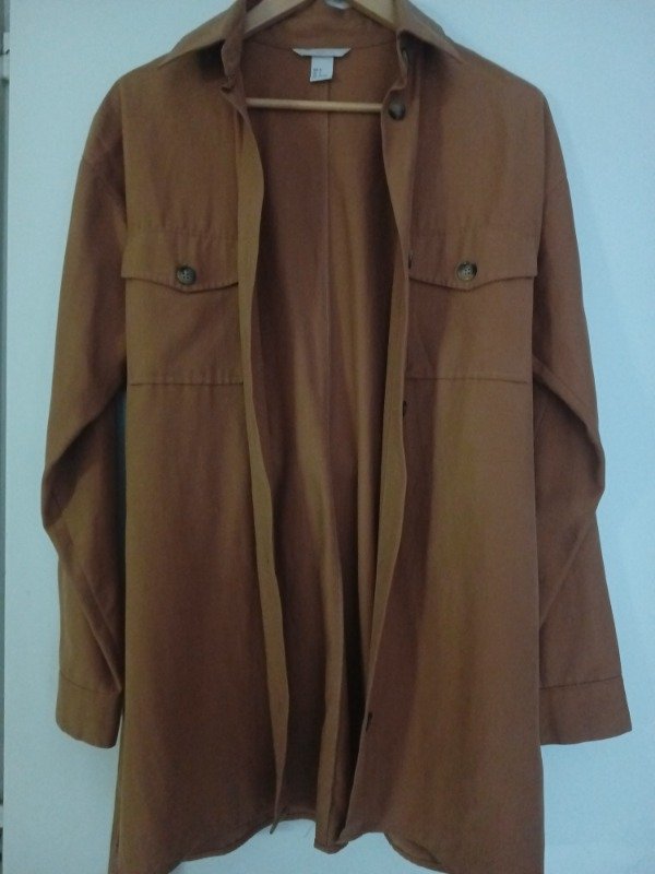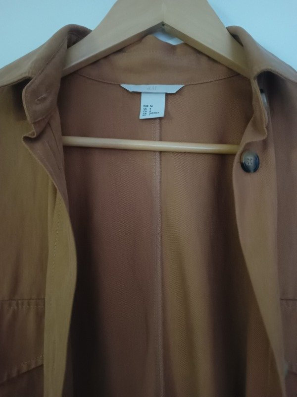 Camisaco marca HyM en tono tostado, con bolsillos frontales y cinto