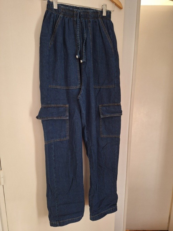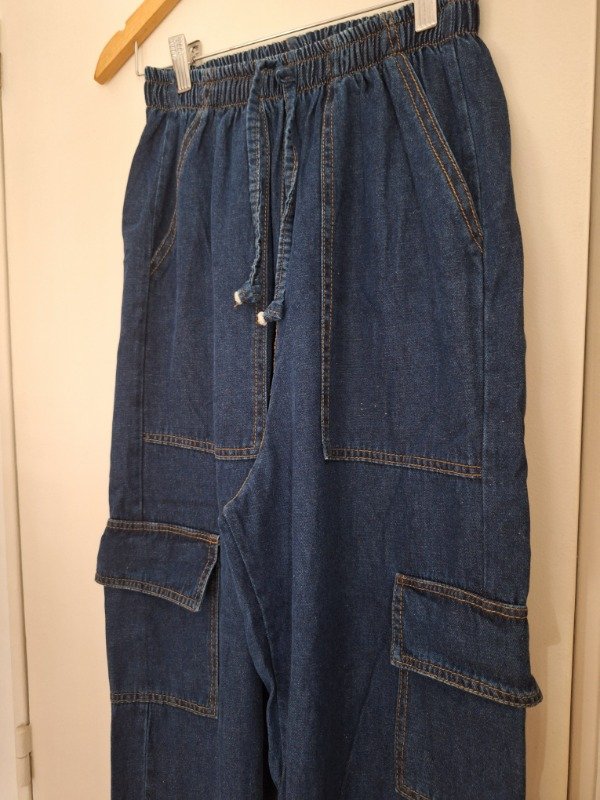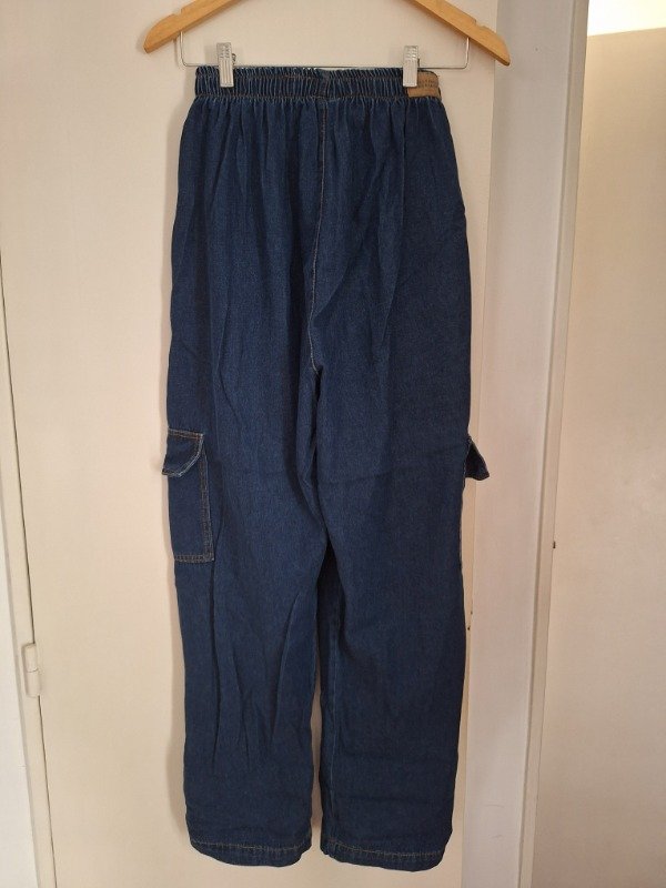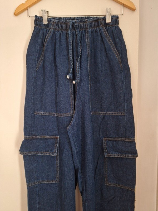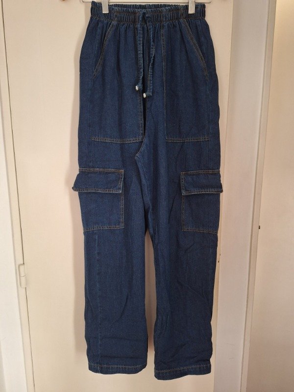 Jean marca Guillermina Regalado, tipo babucha liviana, con bolsillos en piernas. Posee elastico en la cintura, cordon para ajustar y bolsillos laterales