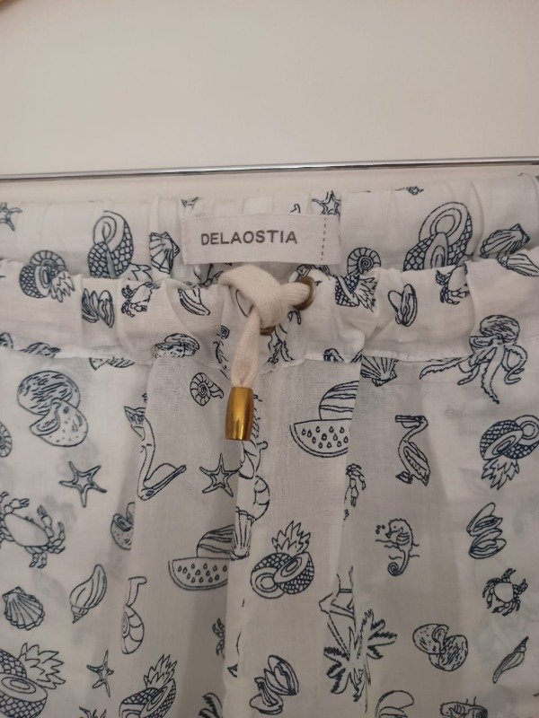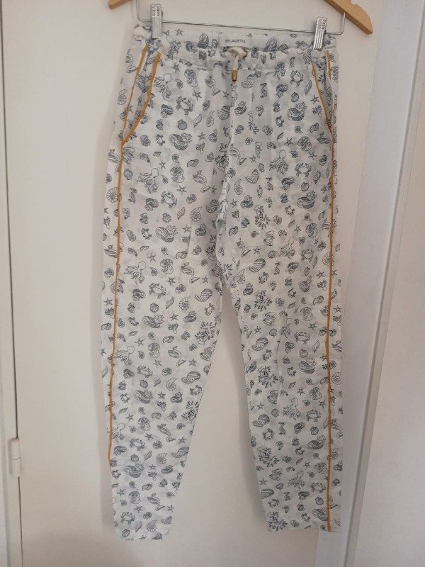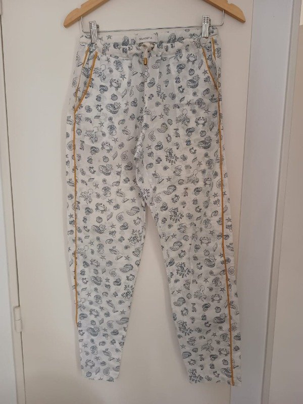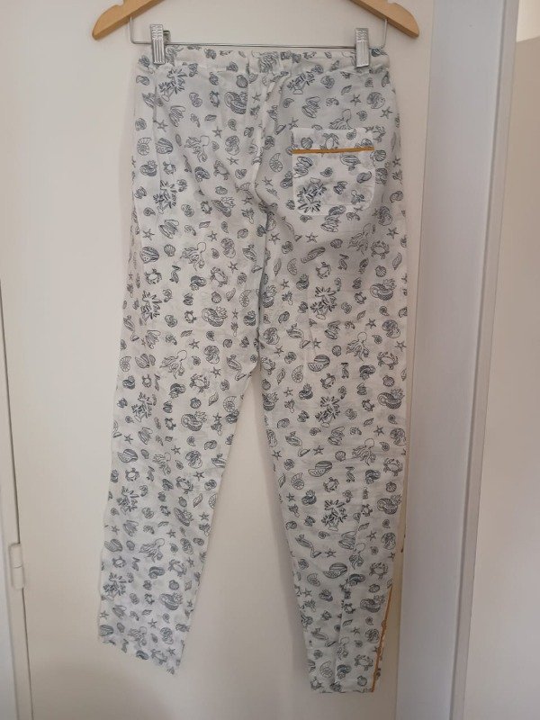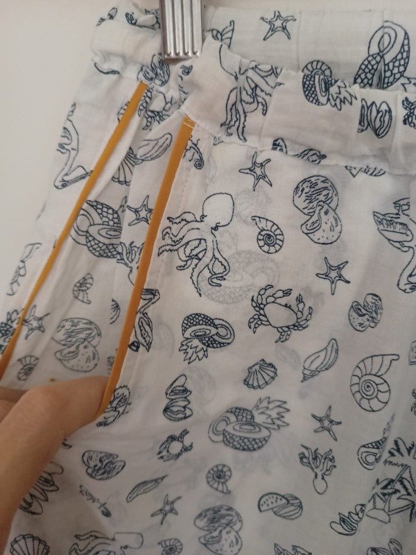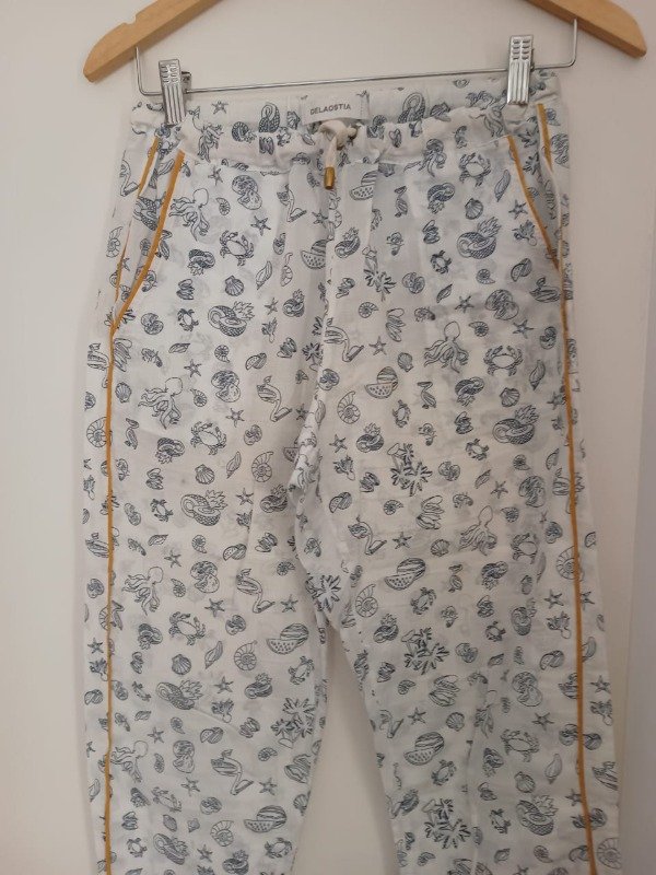 pantalon blanco con dibujos de caracoles y objetos de mar en negro con linea color mostaza en los laterales