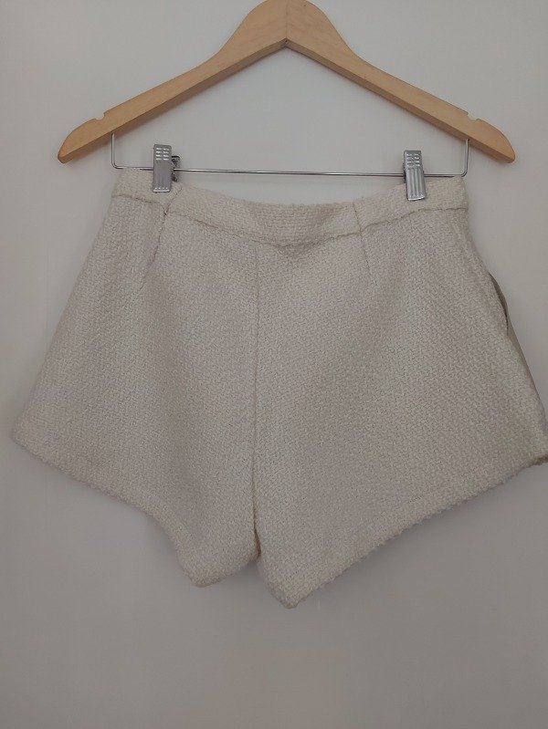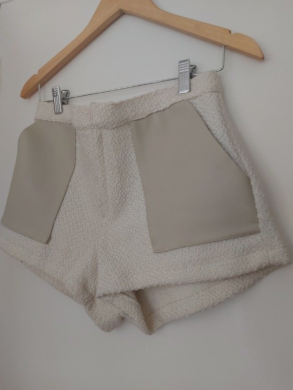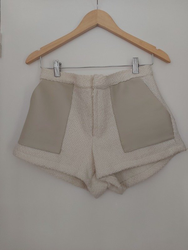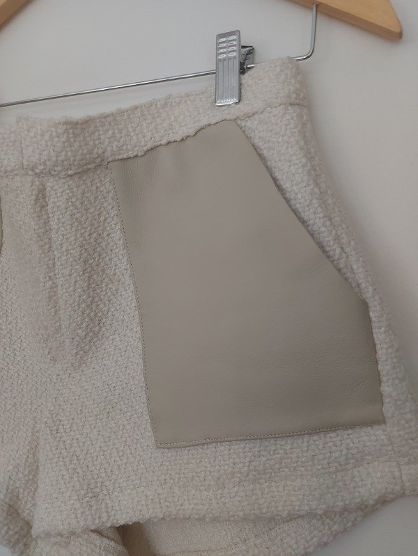 Short marca Justa Petra de lana, en color blanco con detalles de cuero en los bolsillos