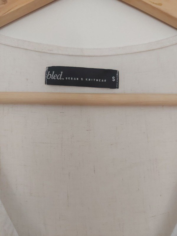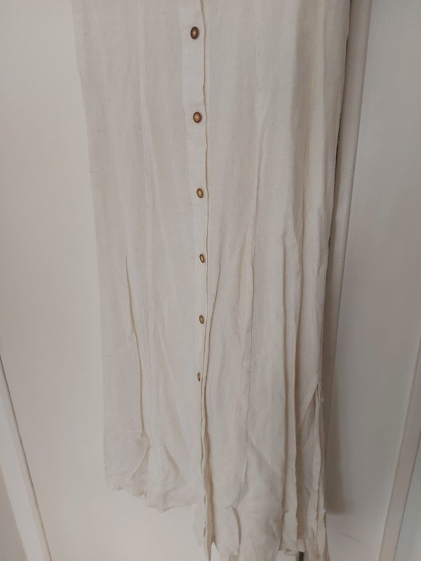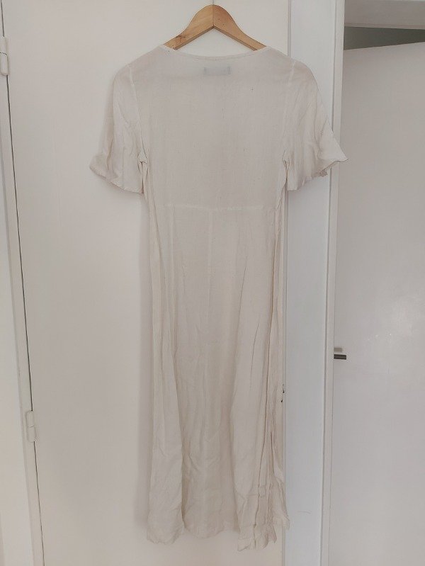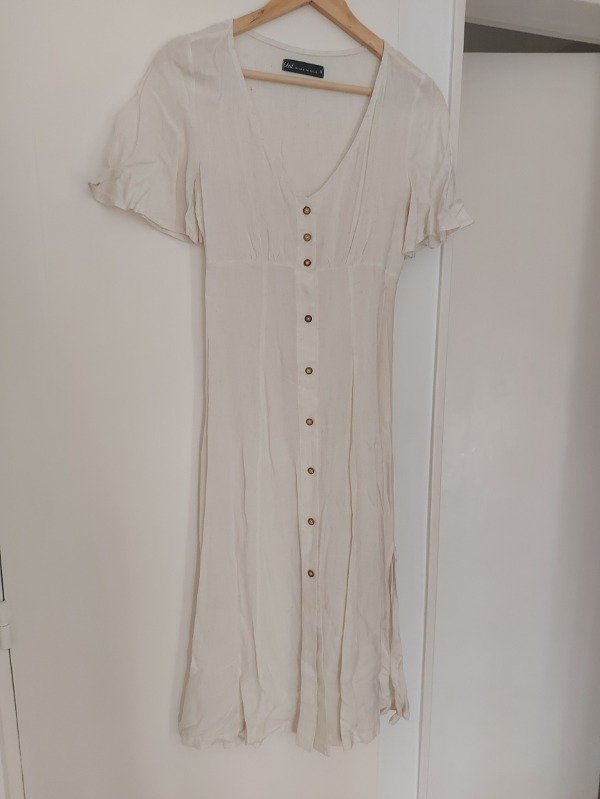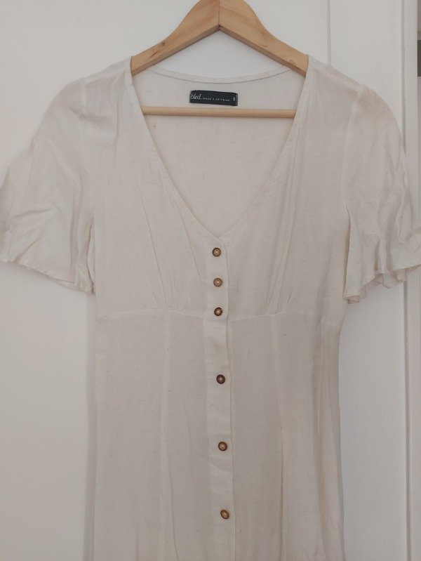 Vestido marca Bled, color natural, con botones al frente y mangas cortas y anchas